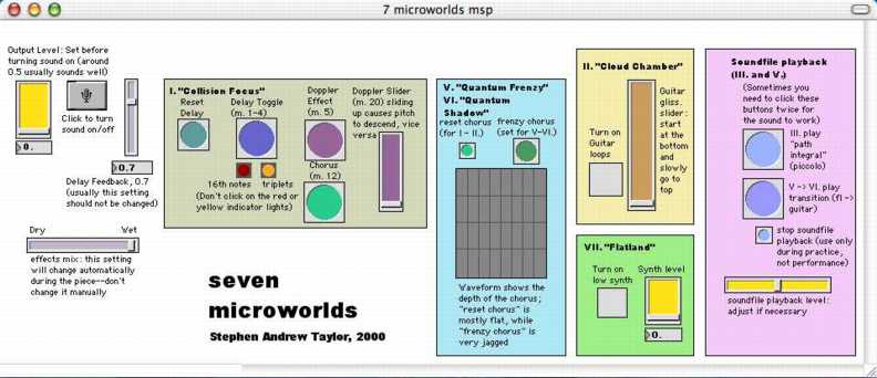 Below is a screenshot of the 7microworldsMSP2007 patch, which the computer operator uses during the piece. Please send me an email if you have trouble using it!