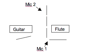The computer and mixer should be placed next to each other, since the computer operator must move the mixer’s faders during the piece. It’s probably easiest to put the guitar in channel 1, and the flute in channels 2 and 3.